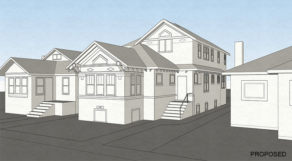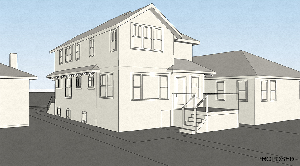 The project plans propose a 2nd floor addition to add a much needed master suite as well as an additional bedroom and bathroom. On the 1st floor, the entry has been opened up, featuring the new staircase and allowing for a closet area with bench. On the exterior, the proposal are sensitive to the historic nature of the bungalow. The addition is setback from the front and details and proportions are in line to highlight the existing house.