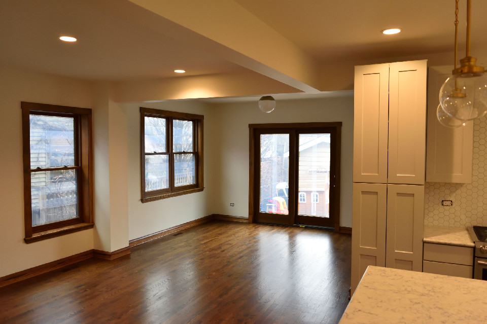 The stairs were relocated to the rear addition, and provided access to the basement from the backyard. The remainder of the porch area was built out as a family room off of the kitchen.