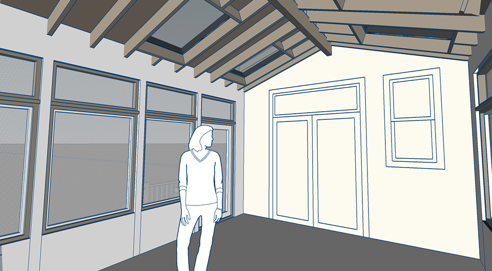 Design Solution:The new rear porch will include an enclosed 3-season room. Full window walls and skylights will bring in light while allowing the room to be open in warm weather. The window proportions and exterior trim are in the craftsman style, which helps unify the new porch with the existing building.