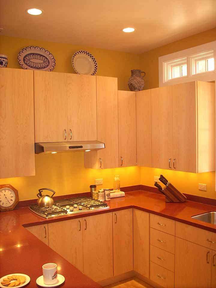 The kitchen was updated and re-finished, with additional storage located in the mudroom. Windows were added to brighten the room. The mudroom serves as a transition between inside and out and has special cabinets and furniture for the family’s pets, a cat and dog. A patio was construction and new landscaping planned for the next few years to complete the backyard garden area.