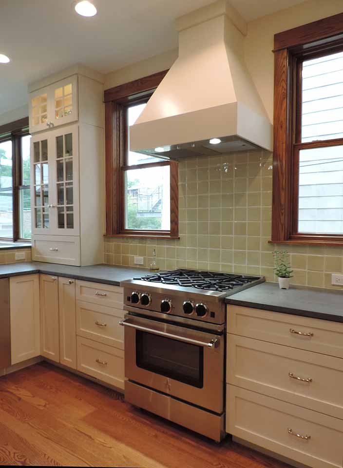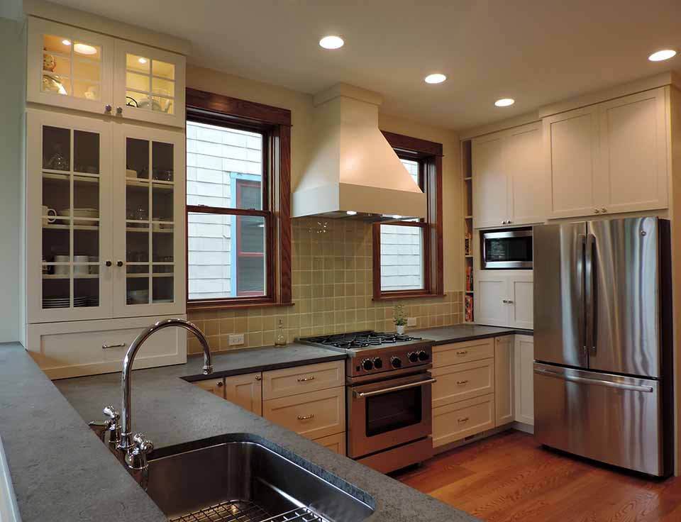The rear porch structure was removed and an addition provided more space on all floors. The kitchen now looked through an eating area into the backyard and was connected to a banquette. New rear stairs were added, windows replaced, and the front door relocated.