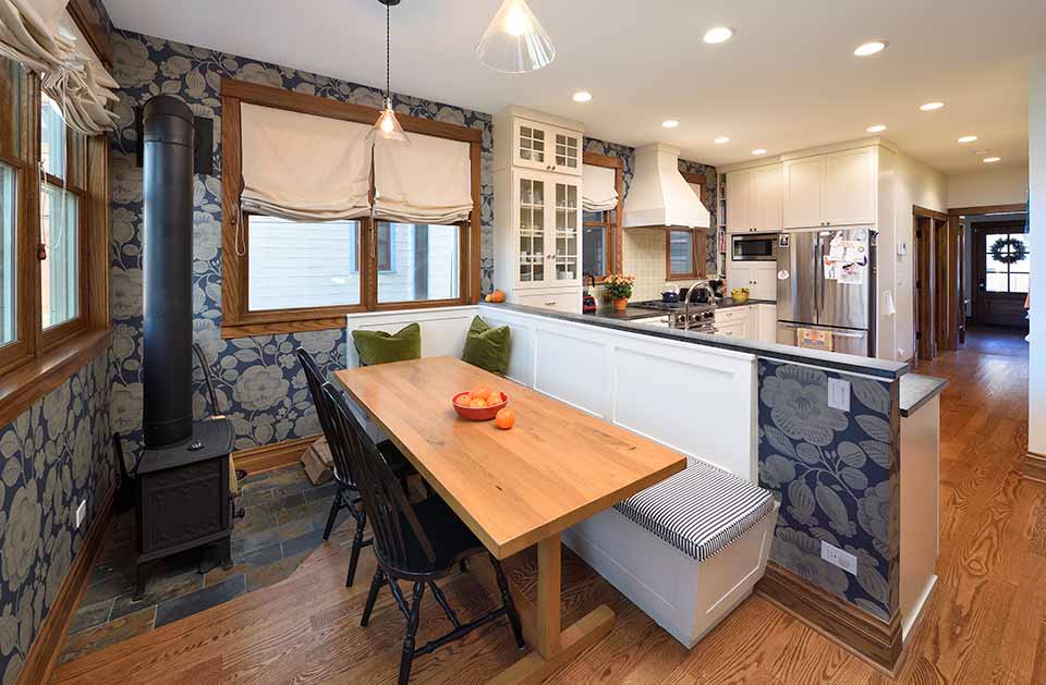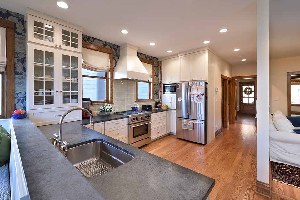 A growing family needed more space for a third child on the way. The rear porch structure was unheated, in need of repair, and did not provide a good transition to the backyard. The kitchen was small and outdated, and did not connect well to the dining room. The front entry door was too close to the stairs.