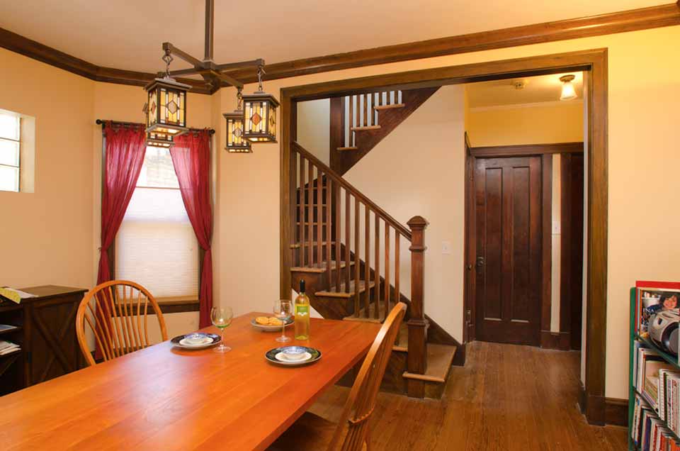 The ceiling in the bedroom and bathroom is sloping under the structure to a height of 11’-6” in the center of the room, adding some drama and largeness to the otherwise modest house. There is a dormer overlooking the backyard, which will lead to a future balcony. The furnace was replaced for the entire house to increase energy efficiency, and the narrow, winding stairs to the basement were enlarged.
