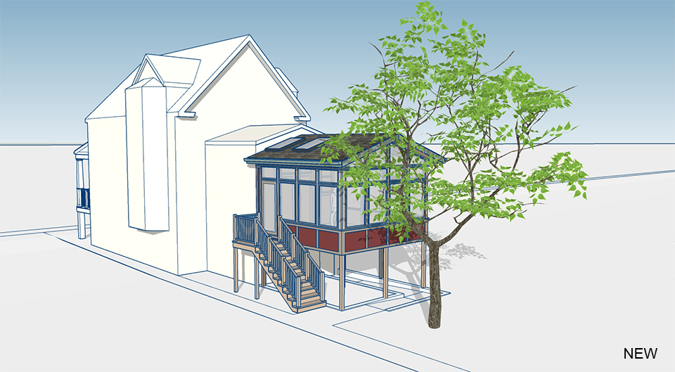 The new rear porch will include an enclosed 3-season room.  Full window walls and skylights will bring in light while allowing the room to be open in warm weather.  The window proportions and exterior trim are in the craftsman style, which helps unify the new porch with the existing building.