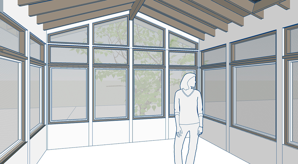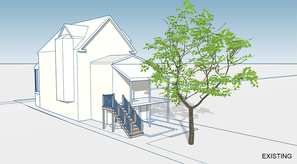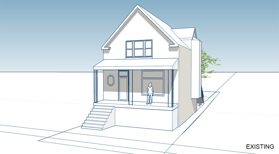 Design Solution:The new rear porch will include an enclosed 3-season room. Full window walls and skylights will bring in light while allowing the room to be open in warm weather. The window proportions and exterior trim are in the craftsman style, which helps unify the new porch with the existing building.
