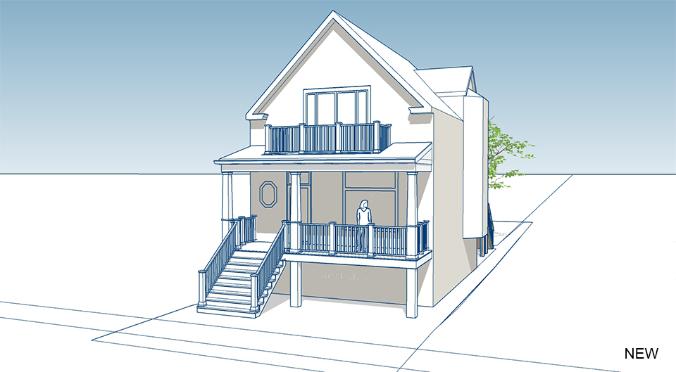 Design Challenge:This existing frame house in Logan Square had an aging front and back porch. The client wanted to replace both porches while adding a new balcony and a three-season room on the rear.