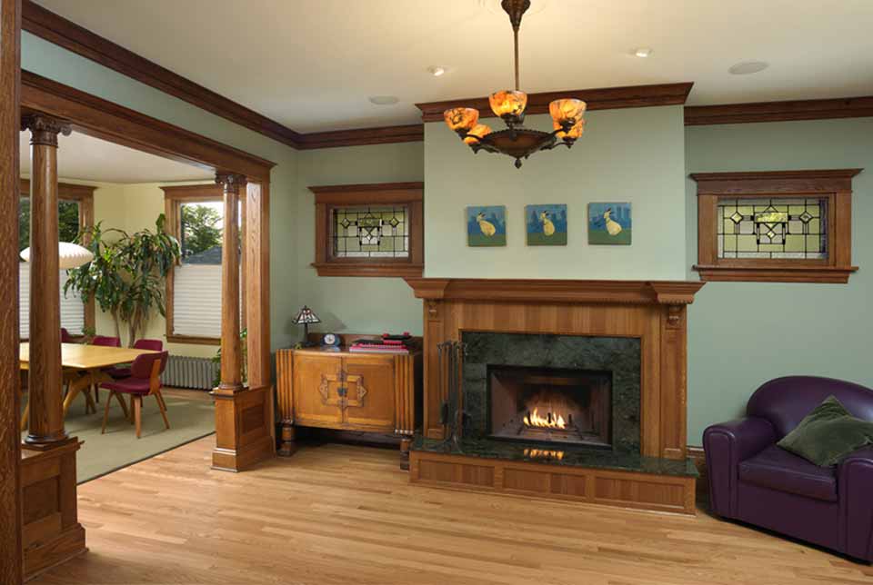 On the first floor, walls were removed to restore light and views through the house. An enlarged kitchen was relocated to provide a connection with the back yard, and a new fireplace flanked by transom windows was added to the living room. The staircase, which had been blocked by walls, was opened up. New handrails were added matching the original. The entire second floor was converted to a Master Suite with an additional guest room. Children’s rooms and a play area are found on the third floor.