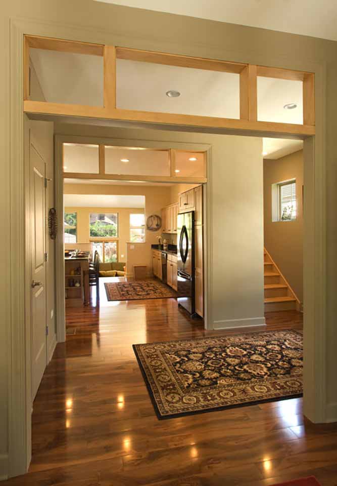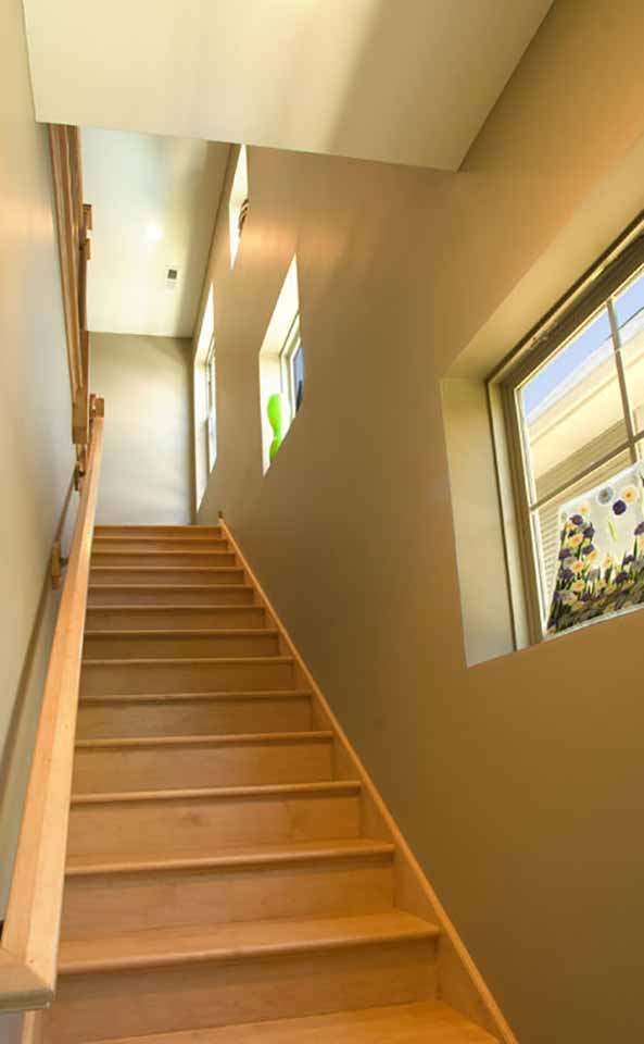 The second floor layout has the master suite at the rear and three bedrooms and bath off of the stair hall. The main idea was to have shifting light which changed throughout the day throughout the house. Natural wood and light colored walls add to a peaceful quality of the home.