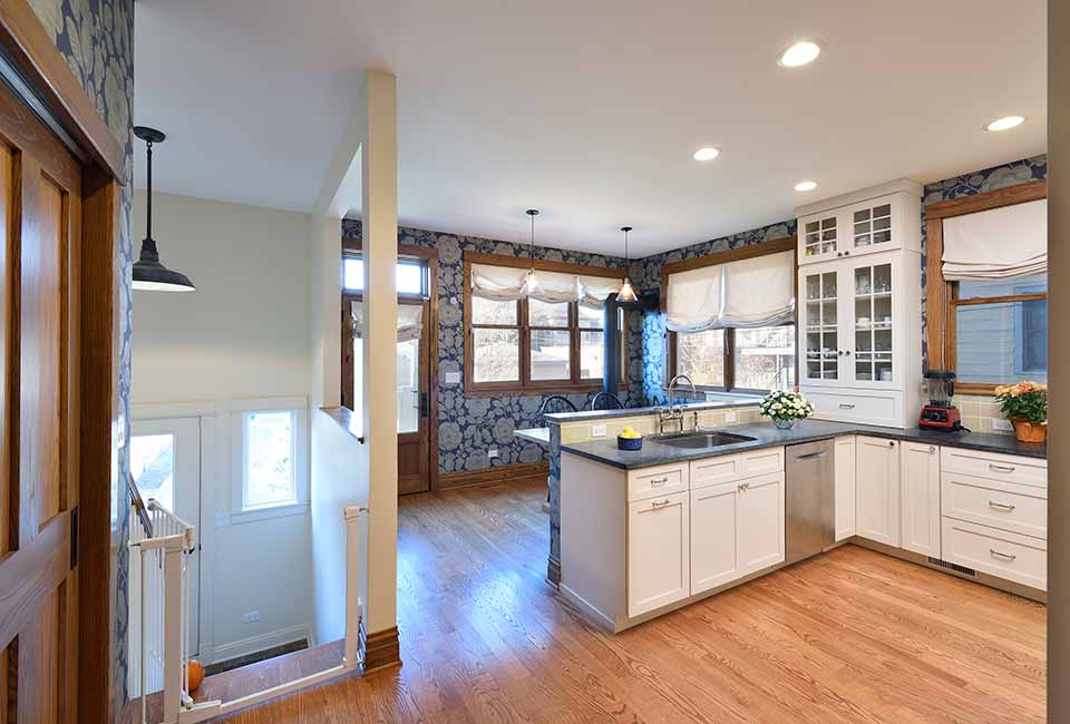 A growing family needed more space for a third child on the way. The rear porch structure was unheated, in need of repair, and did not provide a good transition to the backyard. The kitchen was small and outdated, and did not connect well to the dining room. The front entry door was too close to the stairs.