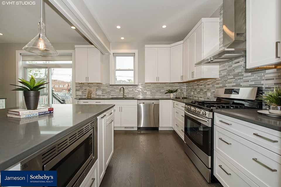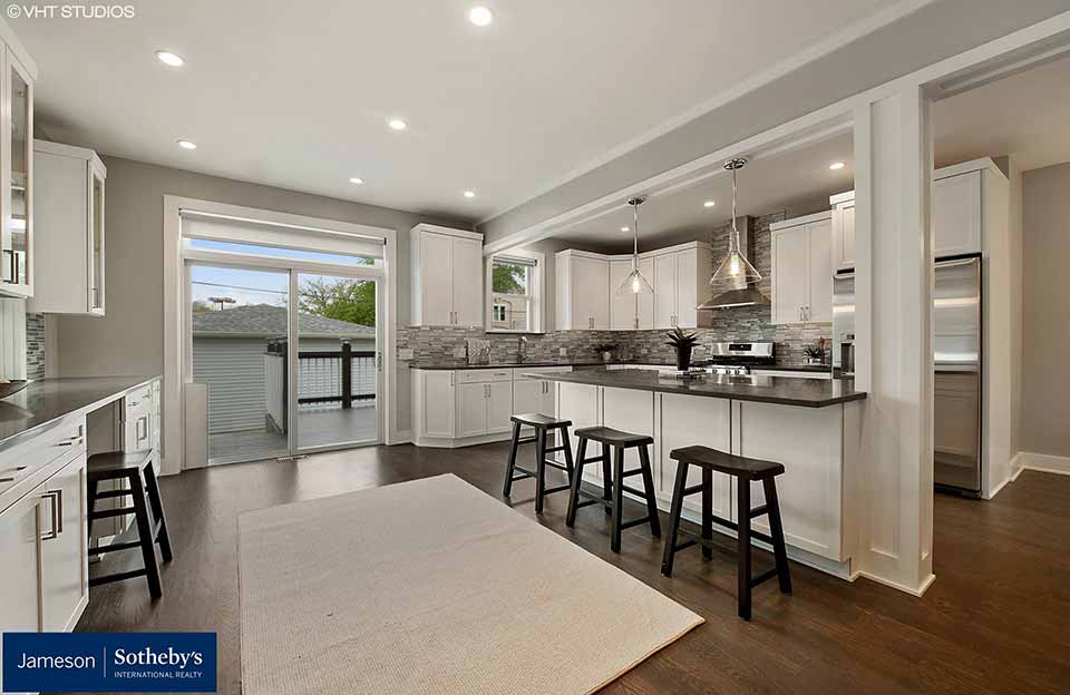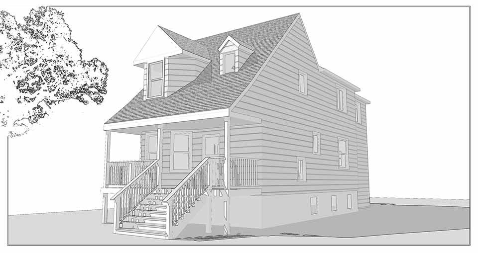 A rear addition and raised dormers were constructed, which expanded space on the first floor, and added full ceiling height on the second floor. The first floor was opened up and the living areas are now open to the kitchen, with large windows, and a door leading to an outdoor deck.