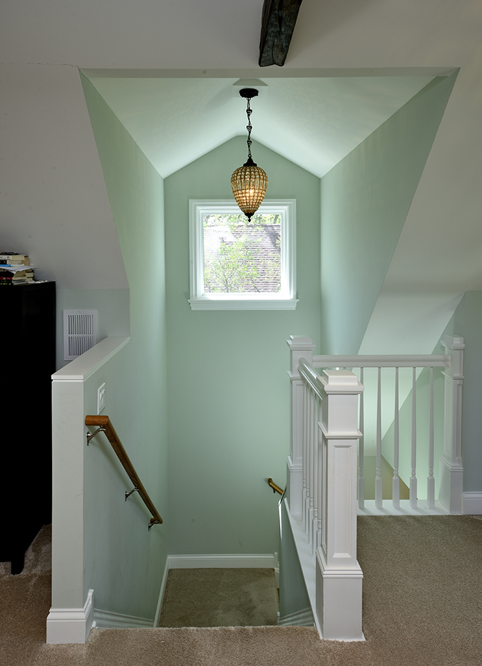 The attic floor became the Master Suite, with a large bathroom and dressing area. Since the Chicago code requires two exits from a third floor, a small deck and stairs were added. The exterior was redone and landscaping added.