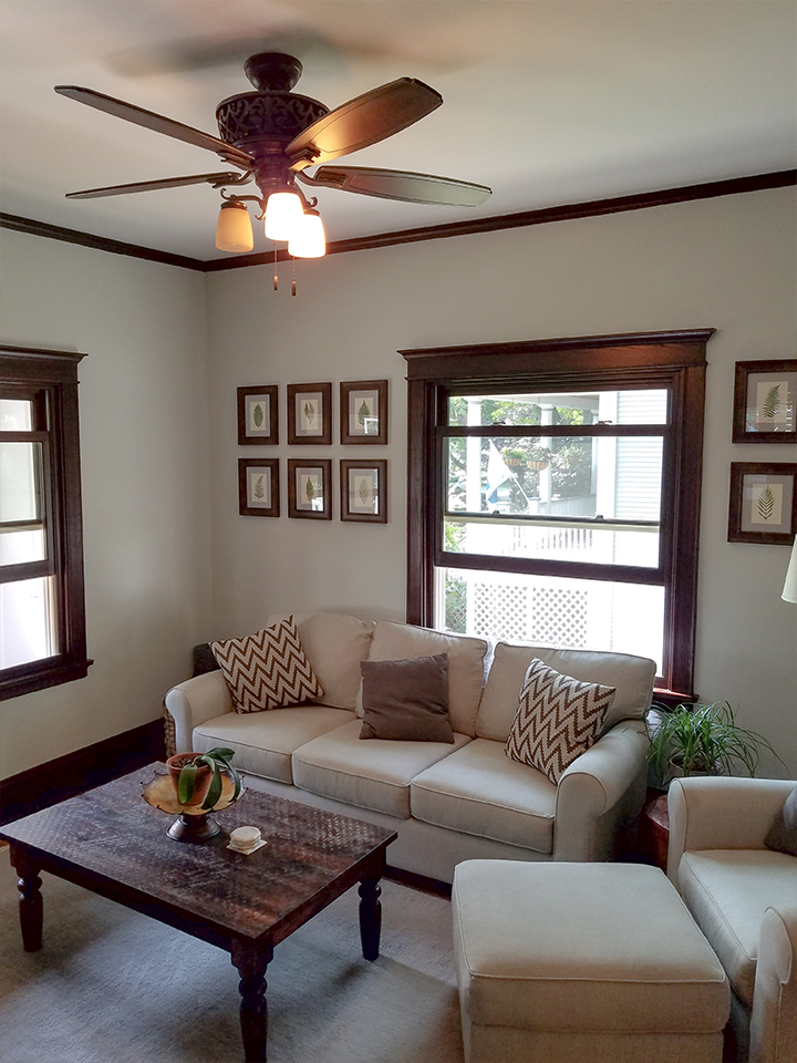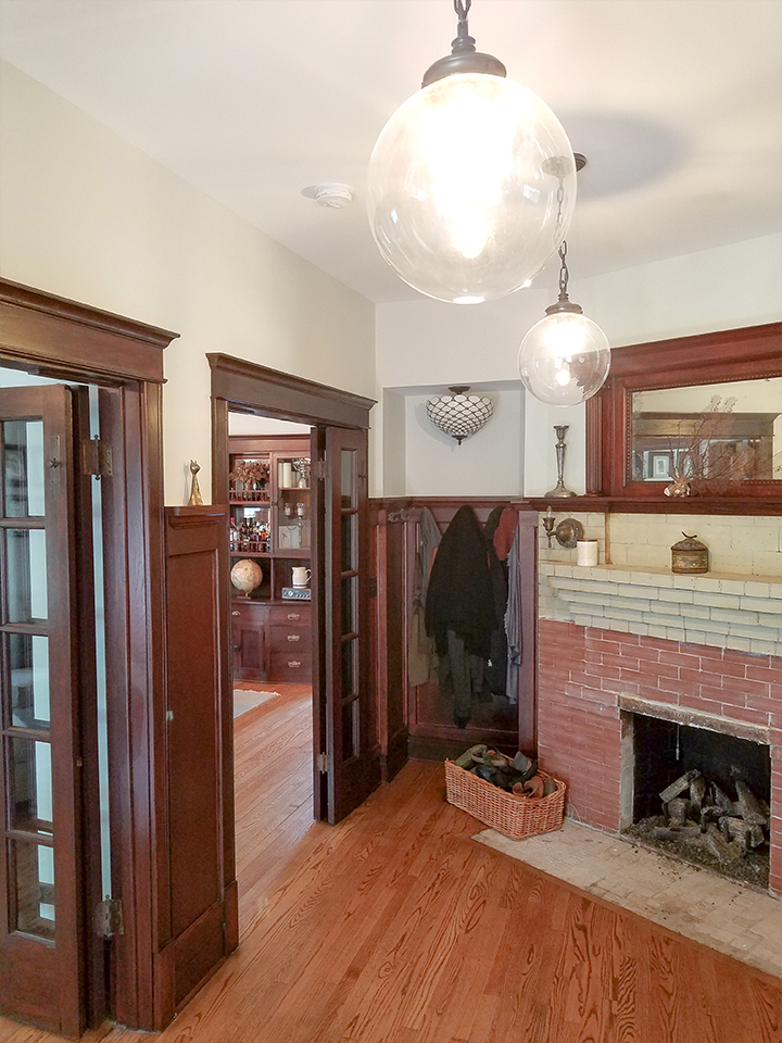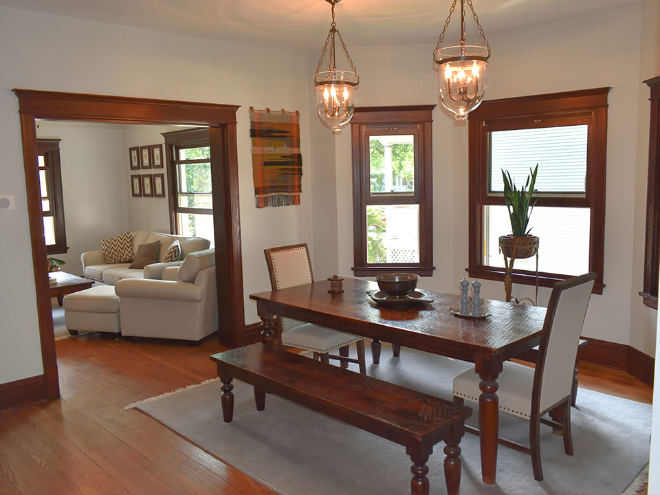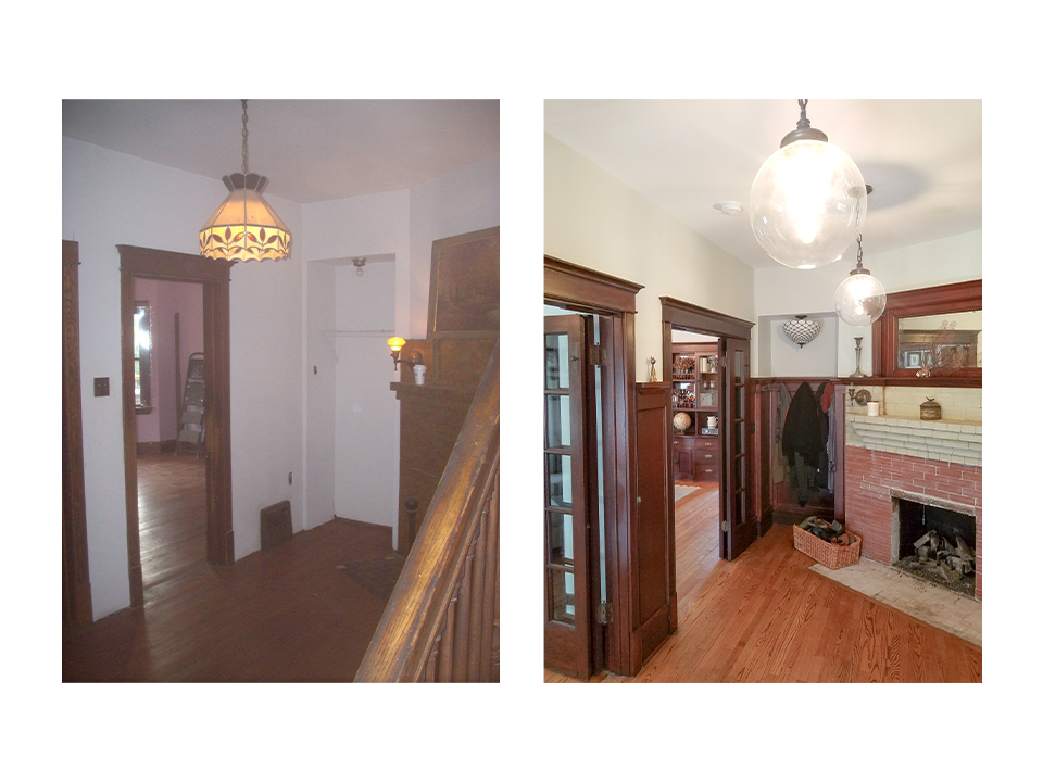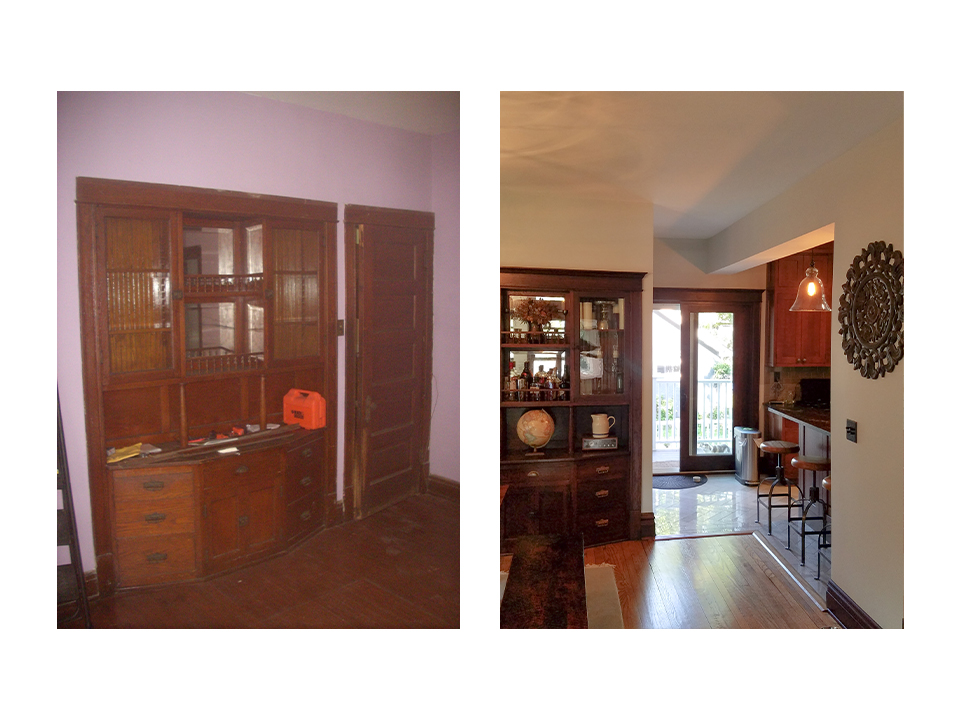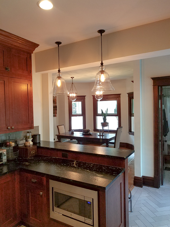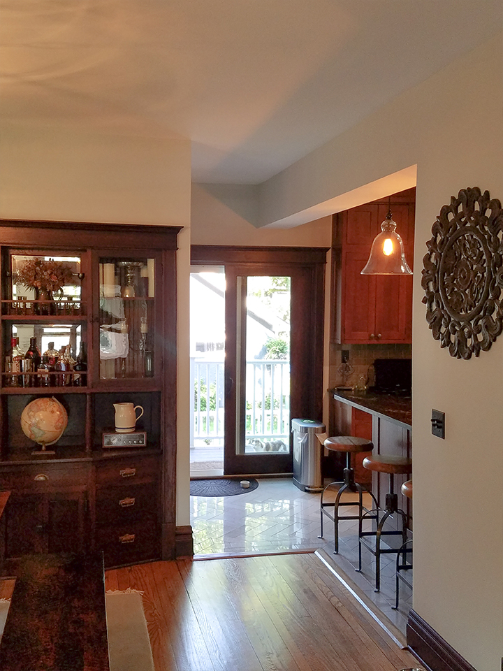 A portion of the load bearing wall was removed at the kitchen and new beams were installed, providing a view of the dining room and a counter that could be used for casual meals. The kitchen was completely renovated, as well as the front entry hall and stairway. Windows were replaced in the front porch and finishes were upgraded.
