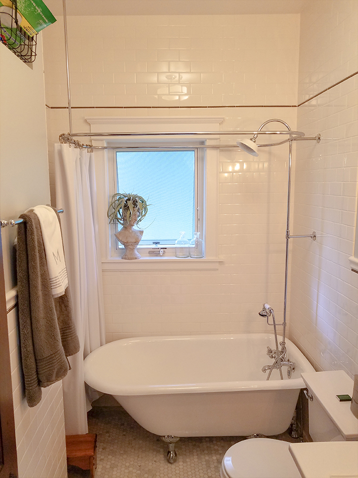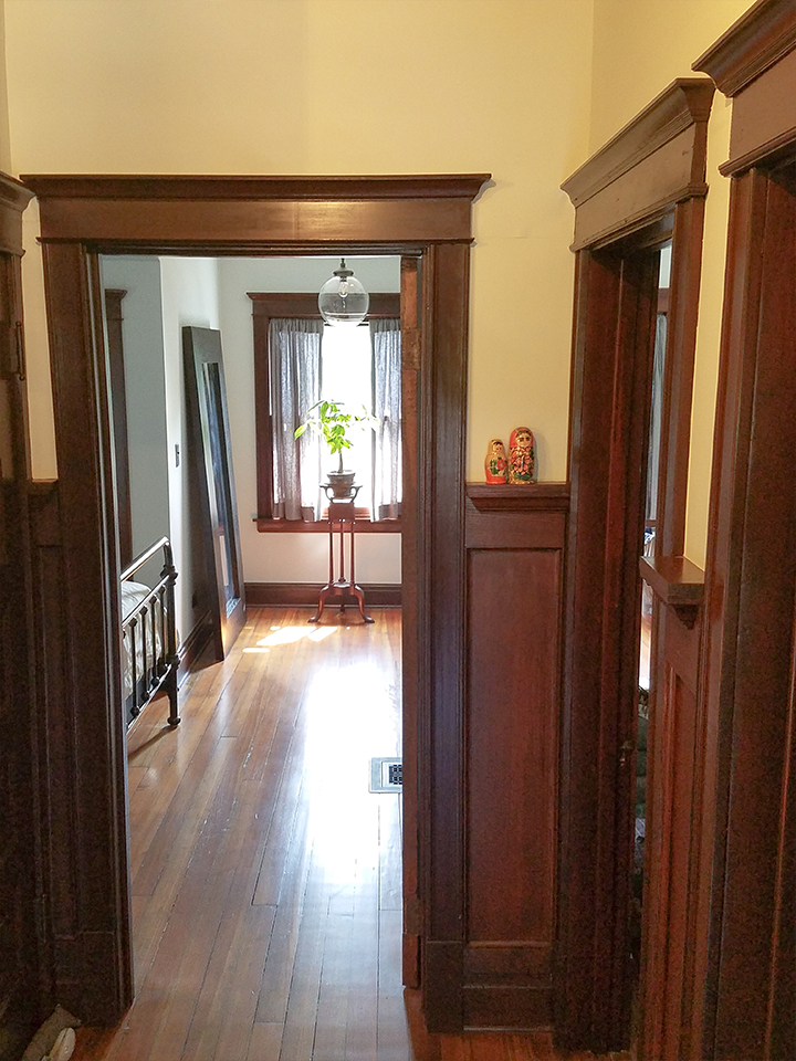 The second floor bathroom was expanded and a shower was added. Since space was tight, a barn door was used. The closet in the master bedroom was enlarged and new doors installed in the other closets. A new furnace was installed. The existing wood wainscot was refinished, new outlets and light fixtures were added.