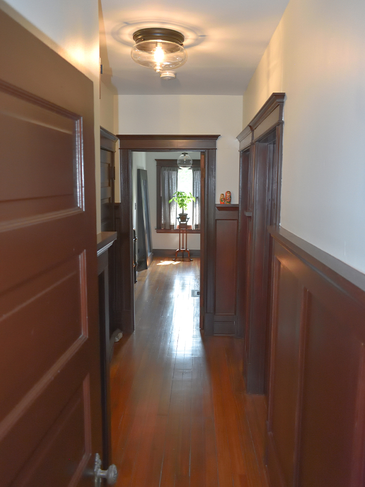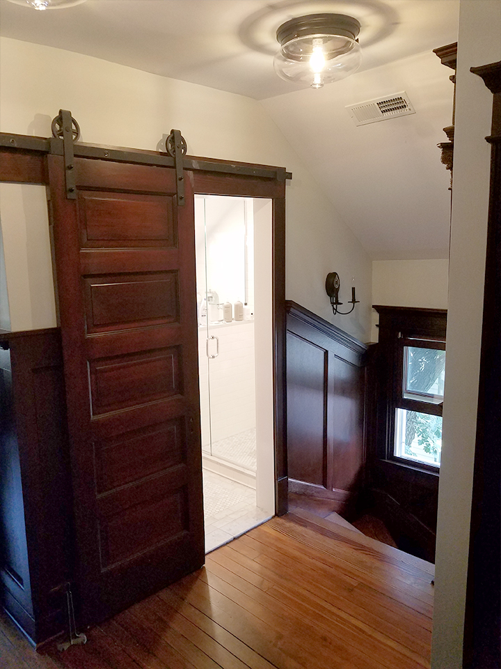 The second floor bathroom was expanded and a shower was added. Since space was tight, a barn door was used. The closet in the master bedroom was enlarged and new doors installed in the other closets. A new furnace was installed. The existing wood wainscot was refinished, new outlets and light fixtures were added.